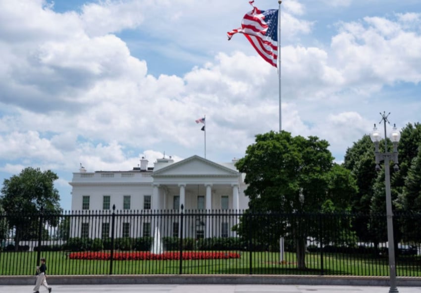 Seorang pengunjung berjalan melewati Gedung Putih dan tiang bendera Terbaru yang dipasang Di North Lawn Di Washington, D.C., Amerika Serikat, Di 19 Juni 2025. FOTO/Reuters